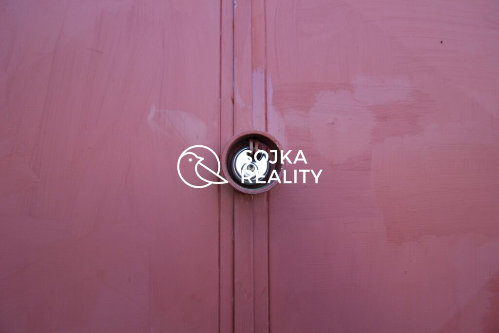 Vstup zajišťují železná dvoukřídlá vrata se třemi zámky, která poskytují bezpečné uzamčení.